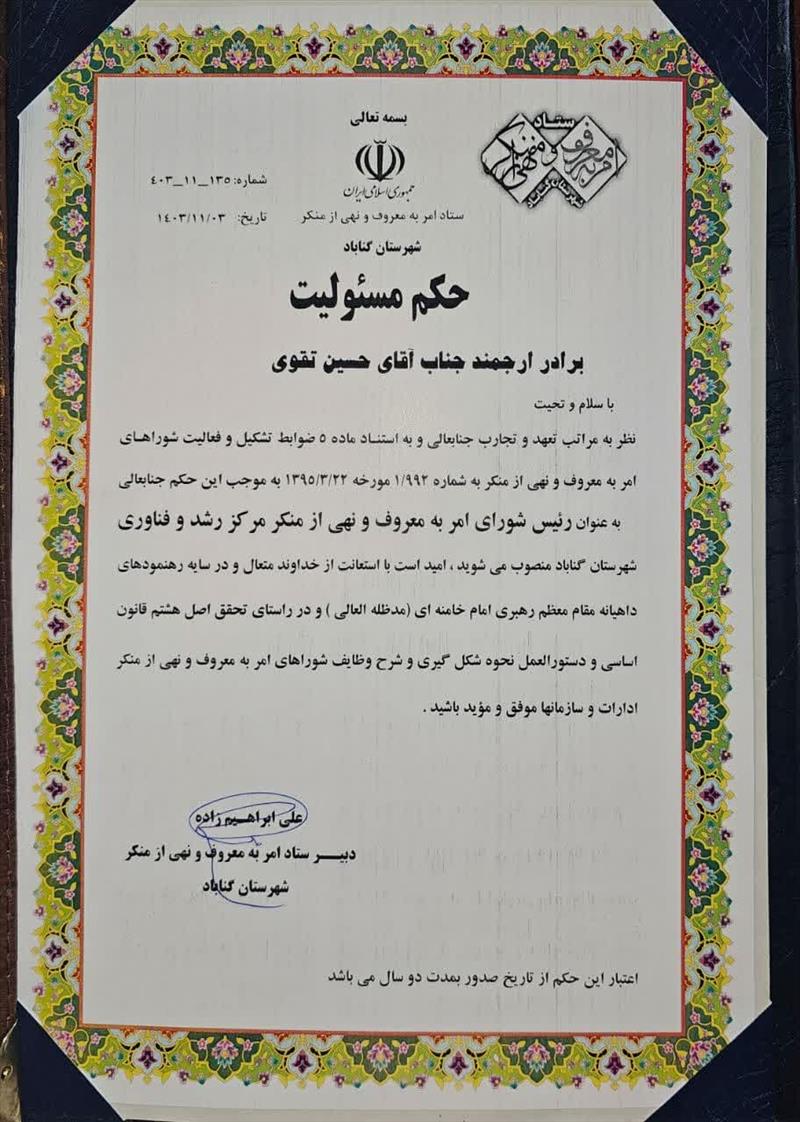 با حکم دبیر ستاد امر به معروف و نهی از منکر شهرستان گناباد، حسین تقوی بعنوان رئیس شورای امر به معروف و نهی از منکر مرکز رشد فناوری گناباد منصوب شد.