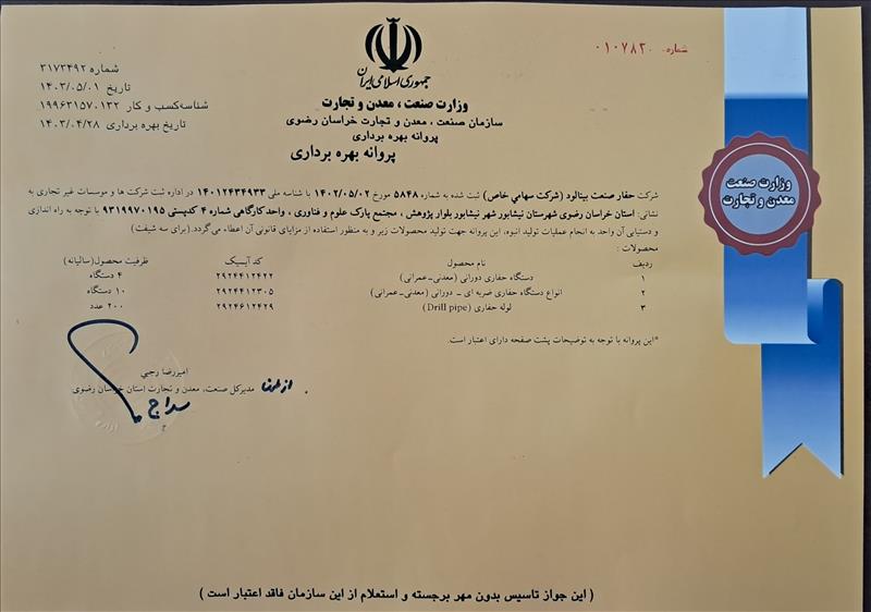 پروانه بهره برداری شرکت فناور حفارصنعت بینالود صادر شد