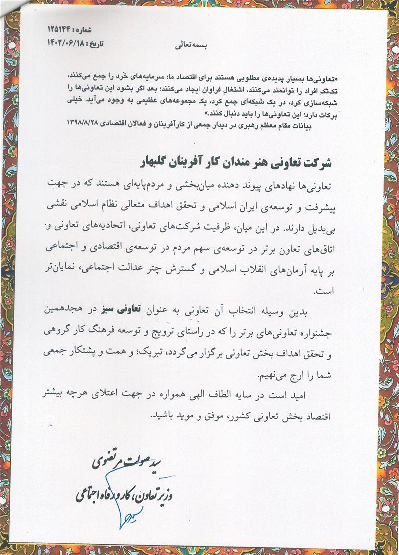 انتخاب شرکت تعاونی هنرمندان کارآفرین گلبهار به عنوان تعاونی سبز در هجدهمین جشنواره تعاونیهای برتر