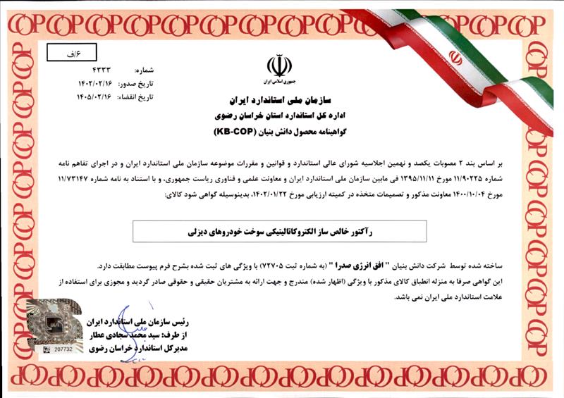 به گزارش روابط عمومی و امور بین‌الملل پارک علم و فناوری خراسان، شرکت دانش‌بنیان افق انرژی صدرا عضو مرکز رشد پردیس انرژی موفق به اخذ گواهینامه محصول دانش‌بنیان (KB-COP) از سازمان ملی استاندارد ایران شد. فرآیند اخذ استاندارد برای شرکت‌های دانش بنیان با دو رویکرد صورت می گیرد، اخذ استاندارد برای کالاهای دارای استاندارد و نیز کالای فاقد استاندارد ملی، بر این اساس کالاهای دانش بنیانی که در کشور طراحی و ساخته می‌شوند و برای آنها در کشورمان و در دنیا استانداردی وجود نداشته باشد، سازمان ملی استاندارد، تاییدیه اعتبار KB-COP بر مبنای دانش اعطا می کند. این تاییدیه از سوی نهاد حاکمیتی استاندارد، سرمایه گذاران را برای سرمایه گذاری در این حوزه ترغیب می‌کند و به این ترتیب استاندارد پلی بین تولیدکننده و سرمایه‌گذار ایجاد خواهد کرد. سازمان ملی استاندارد، در خصوص کالاهای نوآورانه‌ای که هیچ استانداردی برای آنها تعریف نشده، گواهی KB-COP اعطا می‌کند. این گواهی دانش‌بنیان بر اساس ویژگی‌هایی که تولید کننده اظهار می‌کند، صادر می‌شود. براساس این گواهینامه کالای رآکتور خالص‌ساز الکتروکاتالیتیکی سوخت خودروهای دیزلی توسط شرکت دانش‌بنیان افق انرژی صدرا موفق به کسب عنوان KB-COP شد.