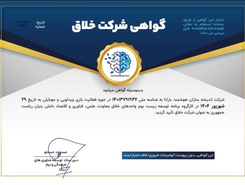 • شرکت فناور اندیشه سازان هوشمند بارانا از شرکت‌های مرکز رشد فناوری نیشابور موفق به اخذ مجوز صنایع خلاق شد